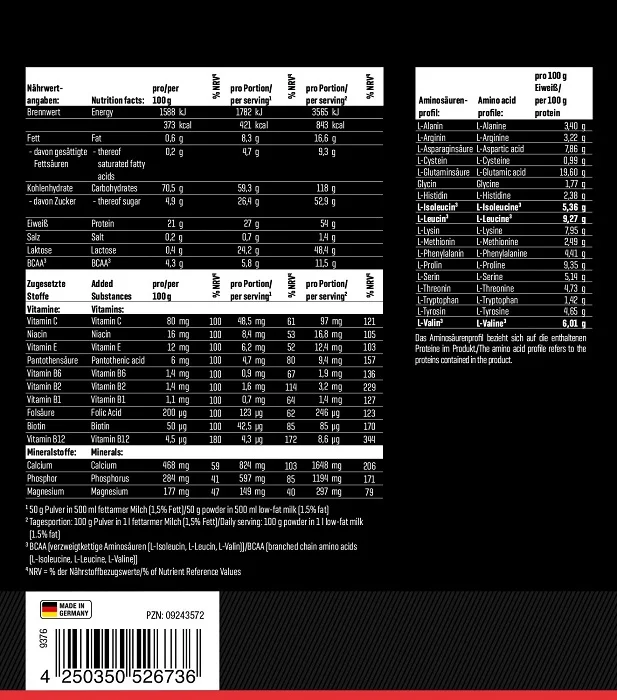 Du kannst so viel essen wie du willst und nimmst nicht oder nur schwer zu? Dieses Problem kennen Hardgainer nur zu gut. Der Grund dafür: Aufgrund ihrer Stoffwechselaktivität und ihrer genetischen Veranlagung verbrennen sie mehr Energie als andere. Der Körper kann nur Muskel- oder Körpermasse aufbauen, wenn am Ende des Tages ein Überschuss an Energie übrig bleibt. Was so simpel klingt, ist für Hardgainer gar nicht so leicht. Mithilfe einer kalorienreichen Ernährung und Kraftsport kannst Du eine Gewichtszunahme erreichen. Einen ordentlichen Kalorienbonus liefert Dir dafür der Power Weight Gainer mit dem Mix aus Eiweiß und Kohlenhydraten. Um die enthaltenen Kohlenhydrate im normalen Energiestoffwechsel als Energie aufzubauen, versorgt unser Power Weight Gainer Deinen Körper mit zusätzlichen B1, B2 und B6 Vitaminen, Niacin und Biotin, die der Körper für die Auf- und Umbauprozesse im Energie- sowie Proteinstoffwechsel benötigt.