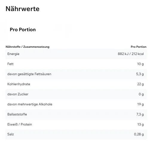 Schokolade mit Süßungsmittel 27 % (Kakaomasse, Süßungsmittel (Maltit), Kakaobutter, Emulgator (Lecithine (Sonnenblume, Raps)), natürliches Vanille-Aroma), pflanzliche Proteine (Sojaprotein, Erbsenprotein, Reisprotein), Feuchthaltemittel