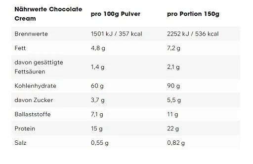 88% Kohlenhydratmischung (Vollkornreismehl, Vollkornhafermehl, Buchweizenmehl, Kamutmehl, Quinoamehl), Molkeneiweißkonzentrat, Sonnenblumenöl-Pulver, Aromen, Salz, Süßstoffe (Acesulfam K, Natrium Cyclamat, Sucralose, Sodium Saccharin), Emulgator (Sojalecithin).