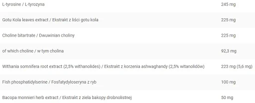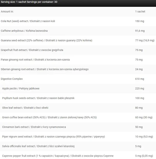 Grünteeblätterextrakt-Komplex [45% EGCG, 90% Polyphenole, 40% Koffein] (Camellia sinensis (L.) Kuntze), weiße Kapselhülle [Farbstoff (E171), Gelatine], Gelatinekapselhülle, Füllstoff (E460(i)), Löwenzahnwurzel-Extrakt (Taraxacum offcinale Web), L-Tyrosin, Gotu Kola Blätter-Extrakt (Centella asiatica (L. ) Urban), Cholinbitartrat, Apfelpektin, Withania somnifera Wurzelextrakt (2,5% Withanolide) (Withania somnifera (L.)), Ingwerwurzelextrakt (5% Gingerole) (Zingiber offcinale Rosc.), Uve Ursi Wurzelextrakt (Arctostaphylos uva-ursi L.), Yerba mate Blattextrakt (Ilex paraguariensis A. St.- Hil.), Stärke, Extrakt aus Cola-Nüssen (Samen) (Cola acuminate (P.Beauv.) Schott Et Endl), rote Kapselhülle [Wasser, Gelatine, Farbstoffe (E171, E122 – kann die Aktivität und Aufmerksamkeit bei Kindern beeinträchtigen)], Brennnesselwurzelextrakt (Urtica dioica L.), Fischphosphatidylserin, Flohsamenschalenextrakt (Plantago afra L. ), Koffein wasserfrei, Extrakt aus Olivenblättern (Olea europaea L.), Extrakt aus Guaranasamen (22% Ca_eine) (Paullinia cupana Kunth), Extrakt aus Blättern des schwarzen Tees (20% Theaflavine) (Camellia sinensis (L.) Kuntze), Extrakt aus der Wurzel des Panax ginseng (Panax ginseng C.A. Mey.), Extrakt aus Grapefruitfrüchten (Citrus paradisi Macfad. ), Extrakt aus grünen Kaffeebohnen (50% ACG) (Coffea arabica L.), Extrakt aus Bacopa monnieri (Bacopa monnieri (L.) Wettst.), Extrakt aus Zimtrinde (Cinnamomum verum J.Presl.), Extrakt aus Klettenwurzeln (Arctium lappa L.), Extrakt aus Selleriesamen (Apium graveolens L.), Extrakt aus Wacholderbeeren (Juniperus communis L. ), Quercetin, Extrakt aus der sibirischen Ginsengwurzel (Eleutherococcus senticosus (Rupr. et Maxim.) Maxim), Extrakt aus den Samen von Pipernigrum (95% Piperin) (Piper nigrum L.), Extrakt aus den Blättern von Salvia o_cinalis (Salvia offcinalis L.), Extrakt aus den Früchten von Cayennepfeffer (1% Capsaicin) (Capsicum annuum L.), Füllstoff (E341), Trennmittel (E551, E470b).