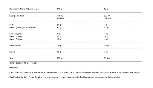 Die Top-Nährwerte sprechen für sich: Dank 15 Gramm Eiweiß pro Riegel unterstützt du mit jedem Bissen deinen Muskelaufbau und Muskelerhalt sowie viele weitere lebenswichtige Prozesse im Körper. Außerdem enthält der Protein Bar nur 1,6 Gramm Zucker – ganz ohne Zuckerzusatz! Auch auf künstliche Aromen, Farbstoffe und Palmöl haben wir komplett verzichtet.