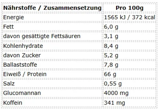 • Glucomannan: 1.000 mg / Port. | 4.000 mg pro 100 g Pulver