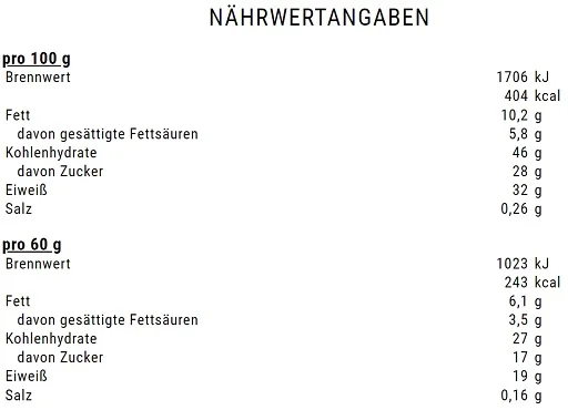 • ganze 19 g Eiweiß pro Riegel, welches zum Erhalt und Aufbau von Muskelmasse beiträgt